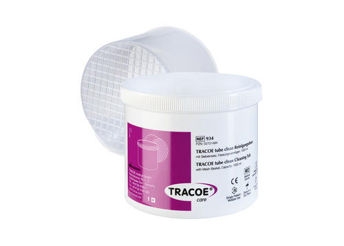 Tub with mesh basket for use with the solution, to clean tracheostomy tubes and the corresponding spare parts and accessories.